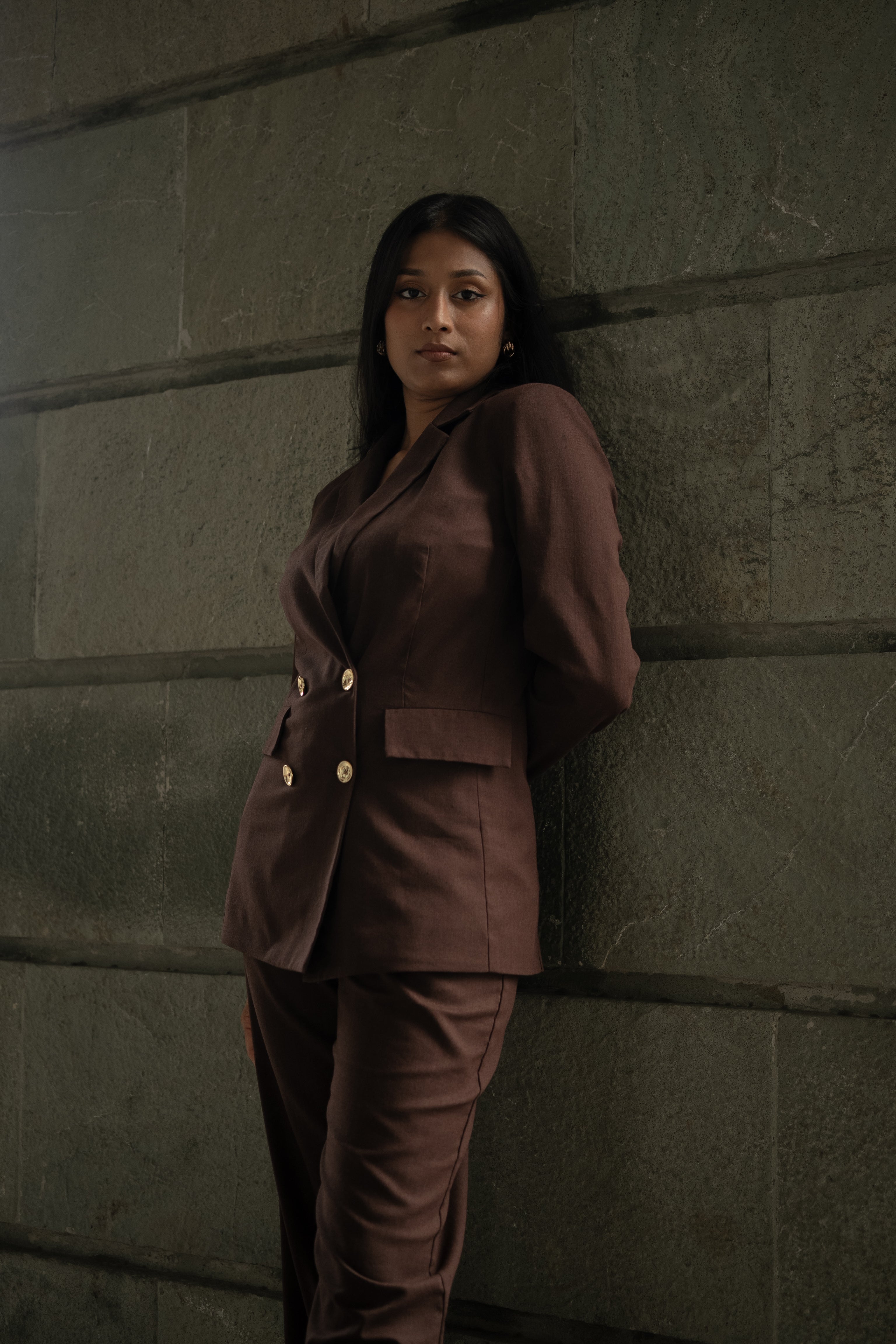 Luxurious gold buttons add a touch of refined glamour, elevating this investment piece from essential to extraordinary. Perfect for professional settings, smart casual occasions, and elevated everyday wear. Pair with the coordinating Dark Brown Tailored Pant for a complete power suit ensemble.